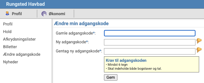 Ændring af adgangskode Ændre din adgangskode Log ind på medlemsloginVælg “Ændre adgangskode” i menuen til venstreSkriv din gamle adgangskode og indtast den nye